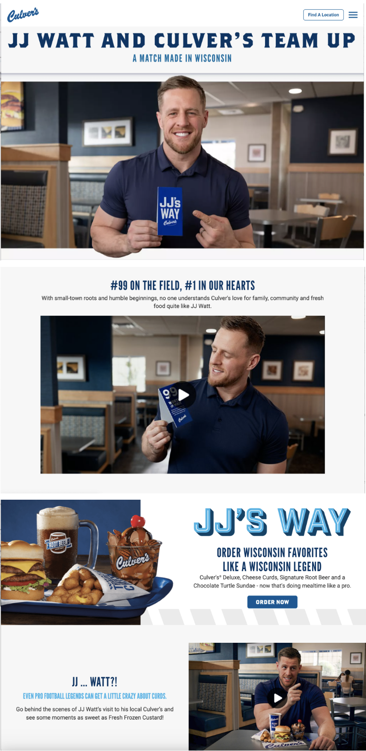 From ordering a meal JJ’s Way and watching curd-tossing outtakes (he never missed!) to hearing the story behind the JJ Watt Foundation from the man himself – this landing page is the hub for all things Culver’s and JJ Watt!